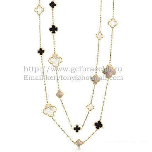 Van Cleef Arpels Magic Alhambra Halskette Gelbgold 16 Motive mit schwarzem Achat weißgrauem Perlmutt